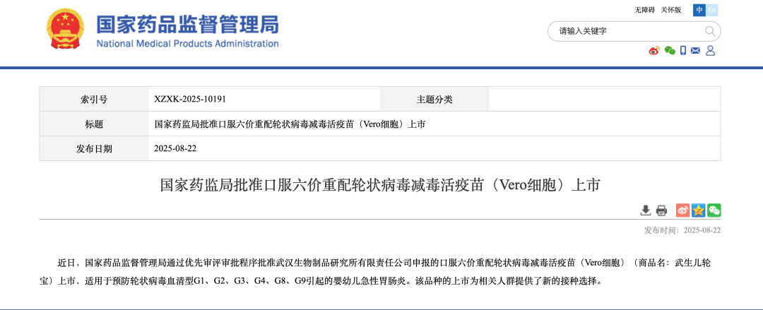 近日,国药集团中国生物武汉生物制品研究所研制的口服六价重配轮状病毒减毒活疫苗(Vero细胞)(商品名:武生儿轮宝®)正式获得国家药品监督管理局批准上市。该产品是全球首款、价次最高的轮状病毒疫苗,为我国预防用生物制品1类新药,主要用于预防轮状病毒引起的婴幼儿急性胃肠炎。