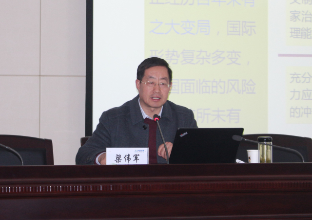 报告会上,梁伟军同志以《筑牢制度根基 实现伟大梦想》为题,对党的十九届四中全会的时代背景、重要意义进行了解析,系统阐述了坚持和完善中国特色社会主义制度、推进国家治理体系和治理能力现代化的重大意义、总体要求、总体目标和重点任务等内容,从历史和实践的维度,用具体的数据和案例为与会人员带来了一场生动、全面、精彩的报告。