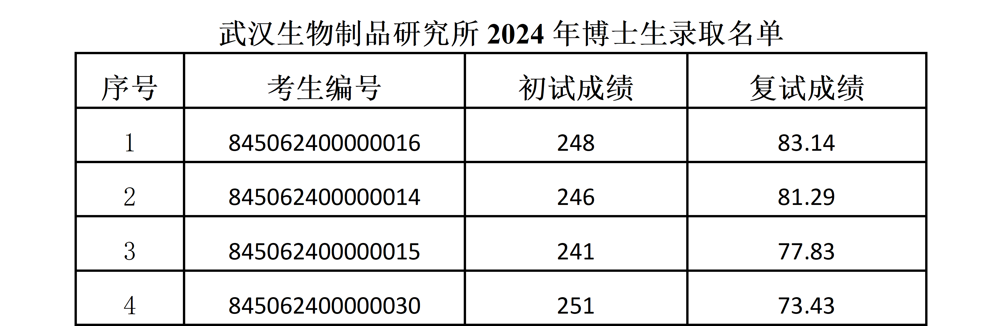 根据教育部《教育部关于做好2024年招收博士学位研究生工作的通知》文件精神,武汉所2024年博士研究生招生录取名单在官网公示(为保护考生隐私使用考生号),公示时间:2024年5月06日-2024年5月19日。公示期间,考生若有疑问,可向我所有关部门反映。武汉生物制品研究所研招办及纪委联系方式: