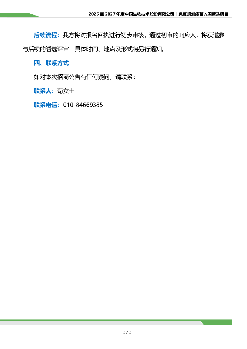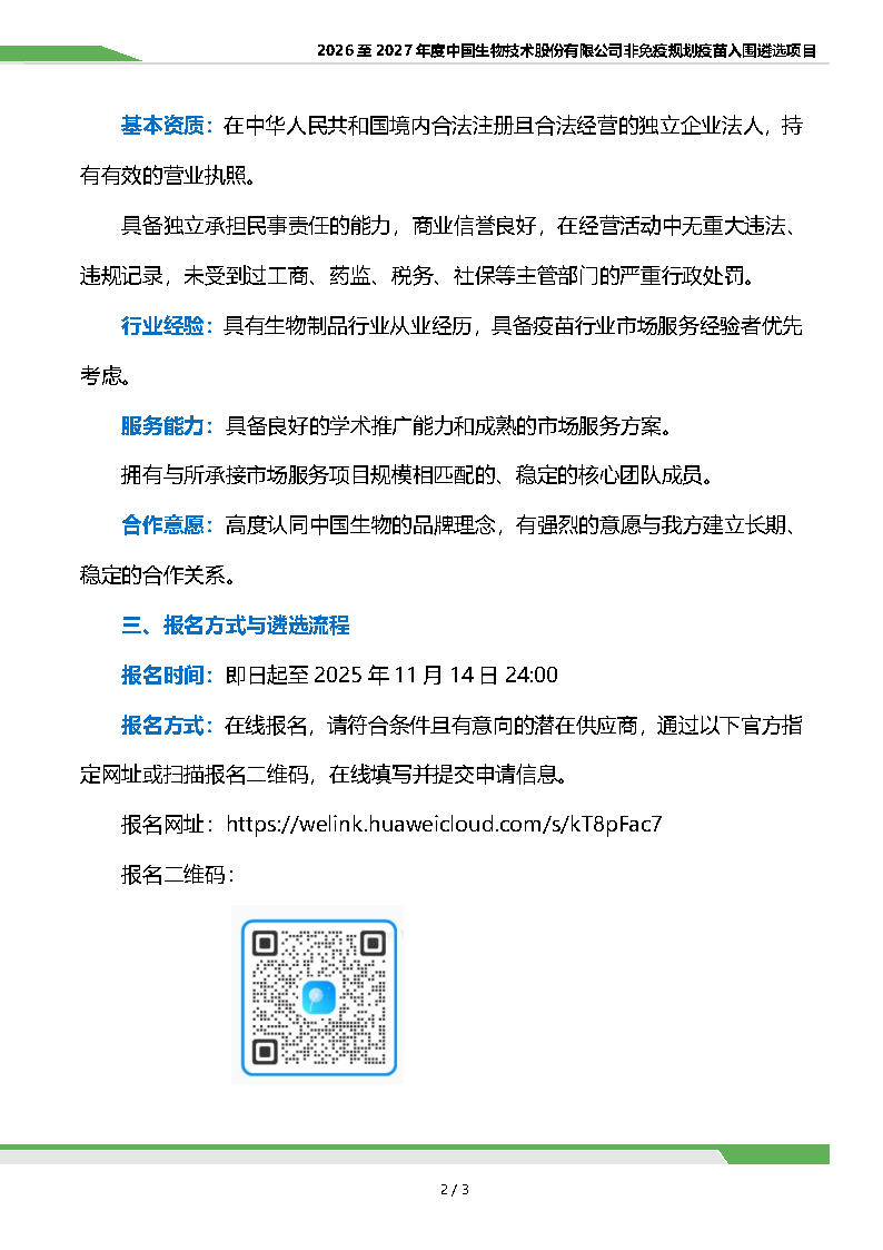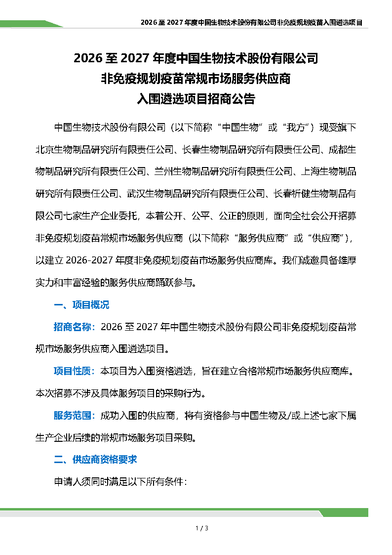 2026 至 2027 年度中国生物技术股份有限公司非免疫规划疫苗常规市场服务供应商入围遴选项目招商公告