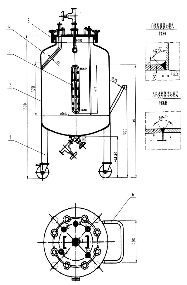 4.3.8.3罐底出口到地面的距离≥350mm,罐内扩物料过流和接触部件的材料采用SUS316L不锈钢,其余材料采用SUS304不锈钢。